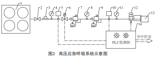 其由高壓氣瓶組1、高壓手動球閥2、高壓氣體過濾器3、高壓壓力表4、高壓變送器5、高壓電動球閥6、高壓減壓閥7、中壓壓力表8、中壓減壓閥9、低壓變送器10、低壓壓力表11、電磁閥12、消音出氣口13和PLC控制柜組成,如圖2所示。