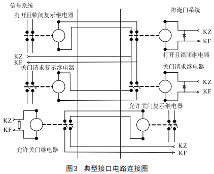 接口電路的設(shè)計(jì)原則滿足"故障一安全"。接口觸點(diǎn)選用安全型繼電器。根據(jù)功能需求常規(guī)設(shè)置"打開且鎖閉繼電器""關(guān)門請求繼電器""允許關(guān)門繼電器"及相應(yīng)的復(fù)示繼電器,防淹門向信號(hào)系統(tǒng)發(fā)送"完全開啟并鎖閉"狀態(tài)表示及"防淹門關(guān)閉請求"信息,信號(hào)系統(tǒng)在收到防淹門"防淹門關(guān)閉請求"信息后,向防淹門發(fā)送"允許防淹門關(guān)閉"信息。一種典型的電路連接如圖3所示。
