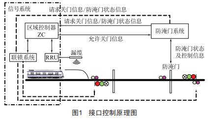 防淹門系統(tǒng)在地下區(qū)間過江段隧道的較低點(diǎn)分別設(shè)置多個(gè)傳感器來檢測實(shí)時(shí)水位信息,若隧道開始積水,傳感器即向系統(tǒng)發(fā)出報(bào)警信息。根據(jù)水位狀態(tài),區(qū)間水位達(dá)到威脅行車安全時(shí),經(jīng)調(diào)度人員確認(rèn)關(guān)閉后,由車控室或就地通過按壓請求關(guān)門按鈕將"關(guān)門請求"通過接口發(fā)送至信號(hào)系統(tǒng)。與此同時(shí),對于基于通信的列控信號(hào)系統(tǒng)由區(qū)域控制器(ZC)通過車地?zé)o線通信與控制區(qū)域內(nèi)列車通信并通過聯(lián)鎖子系統(tǒng)根據(jù)列車實(shí)際位置、門狀態(tài)、進(jìn)路情況計(jì)算后給出移動(dòng)授權(quán),車輛在車載ATP的防護(hù)下運(yùn)行。通過信號(hào)系統(tǒng)確認(rèn)防護(hù)區(qū)間范圍內(nèi)無車占用且無向防護(hù)區(qū)段內(nèi)的進(jìn)路授權(quán)后,向防淹門反饋"允許關(guān)門"信號(hào)。防淹門收到信號(hào)發(fā)出的"允許關(guān)門"信號(hào)后,由車控室或現(xiàn)地人工根據(jù)系統(tǒng)反饋再次確認(rèn),鎖定裝置才能收縮鎖定梁關(guān)閉閘門。信號(hào)系統(tǒng)通過在防淹門控制室的控制柜端子排上設(shè)安全型繼電器作狀態(tài)采集和驅(qū)動(dòng)接點(diǎn),實(shí)時(shí)監(jiān)測防淹門"開啟且鎖閉"狀態(tài),若此狀態(tài)丟失,則運(yùn)行車輛執(zhí)行緊急制動(dòng)。接口控制原理如圖1所示。