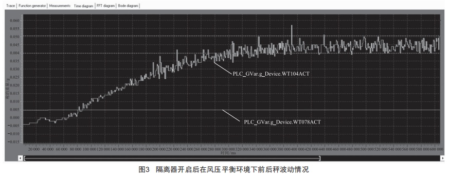 由圖3可以看出,隔離器開啟后壓差調整為33~36Pa,風壓平衡環(huán)境下,前秤WT078波動范圍是0.0045~0.005g,秤的波動為0.0005g左右:后秤WT104波動范圍是-0.005~0.055g,秤的波動為0.060g左右,即隔離器風壓平衡后前秤的波動就很小,后秤波動仍然很大。