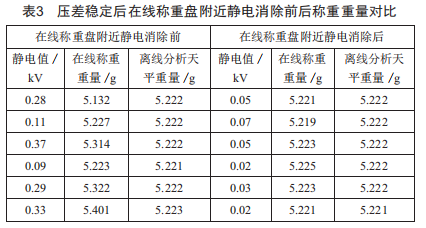 如表3所示,靜電消除前1號灌裝5.2g的西林瓶在離線天平上稱的重量為5.222g,在靜電~.28kV的環(huán)境下在線稱重重量是5.132g:2號灌裝5.2g的西林瓶在離線天平上稱的重量為5.222g,在靜電~.11kV的環(huán)境下在線稱重重量是5.227g:3號灌裝5.2g的西林瓶在離線天平上稱的重量為5.222g,在靜電~.37kV的環(huán)境下在線稱重重量是5.314g:4號灌裝5.2g的西林瓶在離線天平上稱的重量為5.221g,在靜電~.~9kV的環(huán)境下在線稱重重量是5.223g??梢钥闯?靜電越大,在線稱重的重量距離實際重量值偏差就越大。
