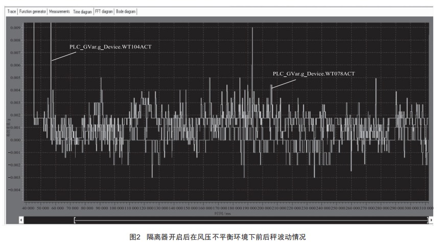 由圖2可以看出,隔離器開啟后壓差調整為30~38Pa,風壓不平衡環(huán)境下,前秤WT078波動范圍是-0.003~0.009g,秤的波動為~.012g左右:后秤WT104波動范圍是-0.002~0.009g,秤的波動為0.011g左右,即受隔離器風壓影響的情況下前后秤的波動都非常大。