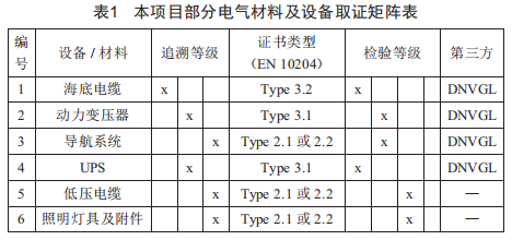規(guī)定檢驗,是指在交貨前,根據(jù)合同的技術(shù)要求,在交貨的產(chǎn)品上進行檢驗,以驗證它們是否符合合同的要求。需要取得規(guī)定檢驗的設(shè)備一般為廠家專門為特定項目進行設(shè)計、原材料采辦、設(shè)備組裝生產(chǎn)及通過特定功能試驗的設(shè)備。以本項目電氣設(shè)備為例,海底電纜是典型的需通過規(guī)定檢驗的設(shè)備。此類檢驗文件分為Type3.2證書和Type3.1證書2類。