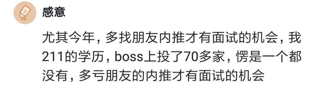 尤其是今年,多找朋友內(nèi)推才能有面試的機會。一位211學歷的網(wǎng)友自己投了70多家,一個面試都沒有,多虧找朋友內(nèi)推才有面試機會。