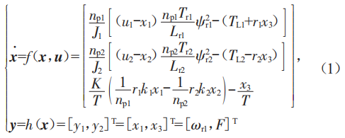 其中,狀態(tài)變量x=[xL,x2,x3]T=[orL,or2,F]T:控制變量u=[.L,.2]T=[oL,o2]T。