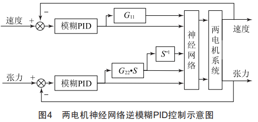 兩電機神經網絡逆?zhèn)尉€性系統(tǒng)具有開環(huán)穩(wěn)定的線性傳遞關系,但神經網絡在擬合原系統(tǒng)時會存在些許誤差,是不完全線性化的,因此加上模糊PID閉環(huán)控制器,從而構成兩電機神經網絡逆模糊PID控制系統(tǒng),如圖4所示。