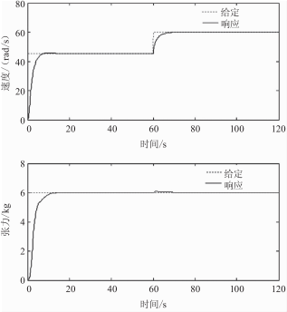 圖8、圖9分別為張力由8kg突增至11kg,速度給定60rad/s不變時,兩電機神經網絡逆開環(huán)及兩電機神經網絡逆模糊PID控制下張力突變時的系統(tǒng)響應波形。