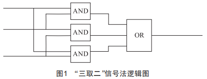"三取二"是指開關(guān)量控制時的投票制,同一信號采用三冗余信號進行表決,兩個滿足即認為條件滿足。"三取二"是為了判斷準確、可靠,防止誤動,常用于保護回路。其邏輯圖如圖1所示。