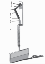 1一原動(dòng)件:3一曲柄:3一連桿:4一銷:5一刀桿:6一銷:7一彈簧。