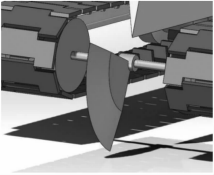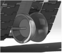 履帶部分實(shí)現(xiàn)行進(jìn)與草料鋪設(shè)功能。工作時(shí),大驅(qū)動(dòng)輪1~3驅(qū)動(dòng)履帶7運(yùn)動(dòng),履帶7下表面接觸地面,推動(dòng)整個(gè)機(jī)構(gòu)向前運(yùn)動(dòng):同時(shí)履帶7上表面接觸貨倉中的草料,將草料帶向貨倉下方的出料口,進(jìn)而使草料平鋪在下部的水平履帶部分,等待插刀下插。小驅(qū)動(dòng)輪5、6帶動(dòng)皮帶8運(yùn)動(dòng),有上行與下行兩種運(yùn)動(dòng)模式,取決于貨倉內(nèi)草料的密度和濕度:當(dāng)草料密度較低時(shí)下行,與履帶7共同將草料向下方帶動(dòng),保證出料量:當(dāng)草料密度較高時(shí)上行,將貨倉底部的部分草料翻至上層,避免底部草料密度過大堵塞出料口。類齒輪4位于貨倉出料口處,隨履帶7運(yùn)動(dòng)而轉(zhuǎn)動(dòng),并在轉(zhuǎn)動(dòng)的同時(shí)將輪齒插入下方履帶上的草料中,將草料分成小堆,保證出料通暢、均勻。