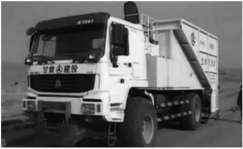 現(xiàn)有投入使用的設(shè)備(圖2)以重型卡車為載體,在車后部載貨部分安裝草料倉和鋪設(shè)機(jī)構(gòu),在車后安裝將草按壓進(jìn)沙地的壓輪(圖3)。