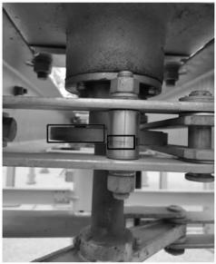 結合上文判據(jù),初步判斷導電臂水平旋轉過程中存在異??闆r。結合故障點發(fā)生的時間對隔離開關傳動部分進行檢查,發(fā)現(xiàn)3.6s時由于主旋轉絕緣子底座拉桿固定螺栓下端與地刀異常接觸,存在卡澀情況,如圖9所示。5.6s時發(fā)現(xiàn)由于導電臂水平旋轉過程中,主旋轉絕緣子底座閉鎖盤與地刀閉鎖軸承接觸過于緊密,造成異???如圖10所示。