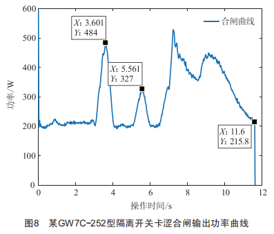 被測隔離開關若不存在上述故障問題,則計算機繼續(xù)比較被測隔離開關的合閘過程平均輸出功率P合和電機額定功率P額,當被測隔離開關合閘過程P合超出P額的y%(y的數(shù)值應根據(jù)不同高壓隔離開關型號決定)時,判定存在卡澀缺陷。