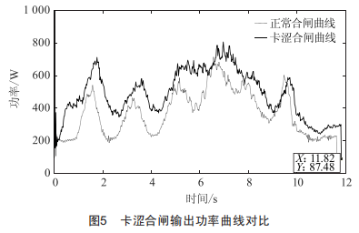 人為模擬隔離開關合閘過程中發(fā)生傳動部分卡澀的情況,得出卡澀狀態(tài)下與正常狀態(tài)下的曲線對比,如圖5所示??瓲顟B(tài)下合閘過程運動11.82s,合閘過程平均輸出功率為490w,比正常狀態(tài)增加115w,合、分閘做功之比為1.62,合、分閘做功之比基本不變。