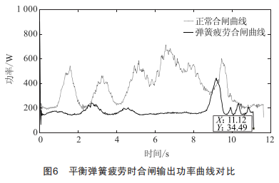 將疲勞的平衡彈簧進行更換后,得出平衡彈簧疲勞狀態(tài)下與正常狀態(tài)下的曲線對比,合閘曲線如圖6所示,分閘曲線如圖7所示。彈簧疲勞狀態(tài)下的合閘過程運動11.12s,合閘過程平均輸出功率為189w,分閘過程平均輸出功率為297w,合、分閘做功之比為0.6,小于1。