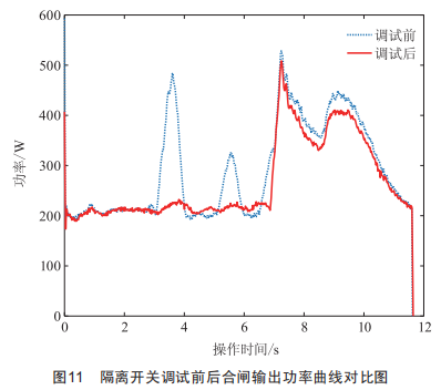 對以上異常卡澀點進行處理后,電機輸出功率曲線恢復正常,如圖11所示。對該站同類型隔離開關檢測結果顯示,大部分隔離開關均存在以上問題,均為安裝工藝不良造成。
