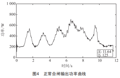 正常機械狀態(tài)下,合閘輸出功率曲線如圖4所示。提取對應狀態(tài)量,該隔離開關合閘過程運動11.64s,合閘過程平均輸出功率為375w,合、分閘做功之比為1.57。