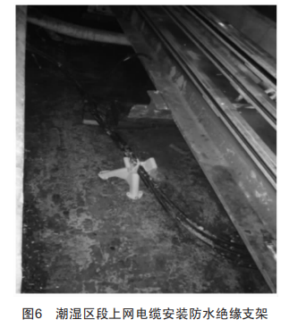 受道床潮濕、積水影響,潮濕區(qū)段上網(wǎng)電纜金屬套管受潮銹蝕,水汽侵入套管內(nèi),加劇了線纜受潮風(fēng)險。在對受潮銹蝕嚴(yán)重的電纜套管進行拆除時,通過技術(shù)創(chuàng)新,在電纜敷設(shè)路徑上安裝了防水絕緣支架將電纜墊高(圖6),以減少電纜受潮風(fēng)險。