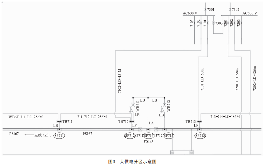 大供電分區(qū)(以圖3中PS167區(qū)為例)一般從區(qū)間開始到站臺位置結(jié)束(越過站臺約40m),這類供電大區(qū)有一個上級電源(圖3中7102饋線開關(guān)),另外與鄰區(qū)通過合上軌旁開關(guān)進行越區(qū)供電:在供電區(qū)中有3個集中上網(wǎng)的位置,分別為上級電源上網(wǎng)位置(4組上網(wǎng)電纜)、區(qū)間上網(wǎng)位置(3組上網(wǎng)電纜)以及供電區(qū)末端的上網(wǎng)位置(4組或3組電纜)。此類供電區(qū)經(jīng)測算得出,只需保留7組上網(wǎng)電纜即可滿足供電需求,計劃通過撤除區(qū)間上網(wǎng)位置3組上網(wǎng)電纜以及末端上網(wǎng)位置1組上網(wǎng)電纜,對區(qū)間電纜進行核減改造,經(jīng)統(tǒng)計共可撤除上網(wǎng)點48處(144根電纜)。