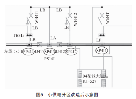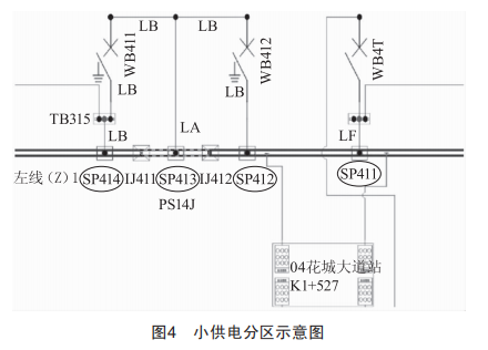 小供電分區(qū)(圖4中虛線PS14J區(qū))位于每個車站的出站位置(出站約40m位置),其設(shè)計初衷為施工作業(yè)時可靈活停電,減小停電檢修時的影響范圍。小供電分區(qū)沒有上級電源,主要依靠閉合與鄰區(qū)相連的軌旁開關(guān),由鄰區(qū)為小供電區(qū)供電。小供電區(qū)只有一組上網(wǎng)電纜(LA代表一個上網(wǎng)點),當(dāng)該組上網(wǎng)電纜出現(xiàn)絕緣故障時,搶修人員必須下線路將上網(wǎng)電纜甩開,還需要在鄰區(qū)接觸軌絕緣節(jié)(圖4中IJ412或IJ411位置)上安裝中間連接板,通過與鄰區(qū)硬線連接并區(qū)的方式恢復(fù)供電。