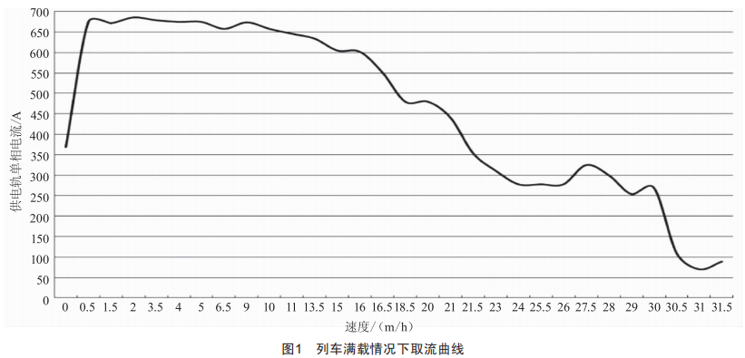 圖1為目前線上2節(jié)車廂列車高峰期滿載運行時的取流曲線,分析取流曲線可知,列車出站加速時,整車取流達到峰值,峰值相電流為686A,按照+10+的條件(686A+68.6A)規(guī)定本次測算時2節(jié)車廂取流最大值為%54.6A。