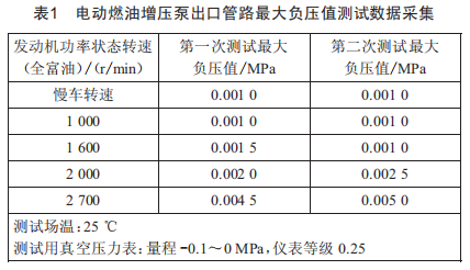 經(jīng)過電動燃油增壓泵出口管路的最大負壓值測試數(shù)據(jù)采集工作,確定了發(fā)動機正常工作時,電動燃油增壓泵出口管路的最大負壓值為0.005MPa,如表1所示。