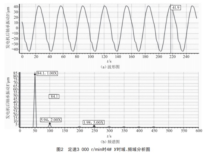其中,2#X/Y軸振在機組啟動過程中均存在較高現(xiàn)象,曾兩次因振動值過高而跳機:定速3000r/min后振動值稍穩(wěn),但帶負荷后該處軸振值呈周期性波動。