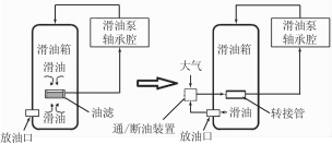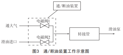 圖1給出了原滑油路以及滑油中斷試驗(yàn)裝置的滑油路示意圖。在原滑油路中,滑油從滑油箱的油濾吸入至滑油泵及附件進(jìn)入軸承腔,再回到滑油箱形成滑油路閉環(huán)。在滑油中斷試驗(yàn)裝置中,用轉(zhuǎn)接管替換油濾形成通路,將滑油放油口通過通/斷油裝置與轉(zhuǎn)接管相連,形成發(fā)動(dòng)機(jī)外部滑油路。這樣,滑油從放油口進(jìn)入通/斷油裝置,通過轉(zhuǎn)接管吸入至滑油泵及附件進(jìn)入軸承腔,再回到滑油箱形成滑油路閉環(huán)。通過遠(yuǎn)程控制通/斷油裝置即可控制大氣與滑油的切換,進(jìn)行滑油中斷試驗(yàn)。