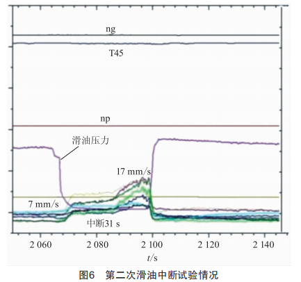按照上述試驗(yàn)程序進(jìn)行兩次滑油中斷試驗(yàn)。其中第一次試驗(yàn),通/斷油裝置由兩個(gè)電磁閥組成,試驗(yàn)過程中因?yàn)橥?斷油裝置無法恢復(fù)滑油供應(yīng)而終止:對(duì)設(shè)備進(jìn)行改進(jìn)后,第二次成功地完成了滑油中斷試驗(yàn)。