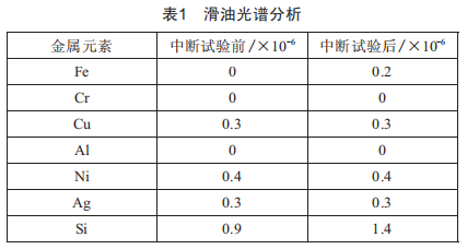 對(duì)所取滑油樣品進(jìn)行光譜分析,表1給出了滑油光譜分析結(jié)果,分析表明,滑油中斷試驗(yàn)前后滑油中金屬元素的含量無明顯變化,說明滑油中斷期間各軸承并無明顯磨損。