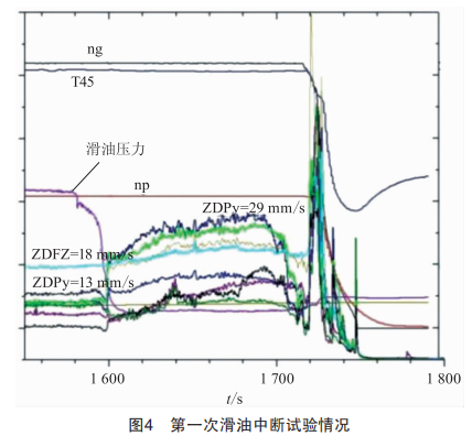 滑油中斷試驗(yàn)已超過發(fā)動(dòng)機(jī)正常工作范圍,有一定風(fēng)險(xiǎn)性,可能干運(yùn)轉(zhuǎn)會(huì)引起磨損、過熱而導(dǎo)致零部件損壞,首當(dāng)其沖的便是與潤(rùn)滑有關(guān)的零部件,如軸承、齒輪、滑油泵、封嚴(yán)環(huán)等。因此,試驗(yàn)過程中應(yīng)嚴(yán)格落實(shí)與試驗(yàn)有關(guān)的監(jiān)控措施。對(duì)于發(fā)動(dòng)機(jī)平穩(wěn)運(yùn)行最敏感的參數(shù)就是振動(dòng),試驗(yàn)中應(yīng)密切注意監(jiān)控參數(shù)的變化,確保發(fā)動(dòng)機(jī)安全運(yùn)轉(zhuǎn)。