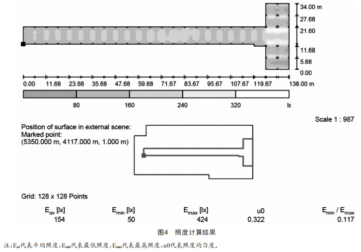前面做的所有工作都是為了生成照度計(jì)算結(jié)果,生成后首先設(shè)計(jì)人員應(yīng)與執(zhí)行標(biāo)準(zhǔn)比對(duì),找出燈具布置不合理的平面,然后根據(jù)計(jì)算報(bào)告對(duì)不合理的燈具布置進(jìn)行調(diào)整,再對(duì)修改后的燈具布置重新計(jì)算直到符合要求,最終得到符合要求的照度計(jì)算結(jié)果。所有計(jì)算區(qū)域的照度計(jì)算結(jié)果匯總后與計(jì)算執(zhí)行標(biāo)準(zhǔn)以及燈具選型原則合并,即可得到一份完整的照度計(jì)算報(bào)告。圖4為某項(xiàng)目管橋下的照度計(jì)算結(jié)果。