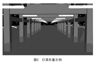燈具布置有多種方式:(1)對(duì)于管橋及矩形平臺(tái),可以使用矩陣排列方式:(2)對(duì)于走道,可以使用直線排列方式:(3)對(duì)于圓形平臺(tái),可以使用圓形排列方式:(m)部分區(qū)域燈具布置無(wú)規(guī)則,可以使用單一布置方式。圖3為某項(xiàng)目管橋下燈具布置圖。