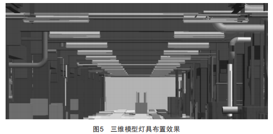 布置燈具可以使用鼠標(biāo)拖拽的方式或直接在燈具屬性中輸入坐標(biāo)數(shù)據(jù),當(dāng)一類(lèi)燈具初次布置完成后,此類(lèi)燈具可以直接使用復(fù)制的方式在模型中布置。圖5為某項(xiàng)目管橋下燈具在三維模型中的布置效果,因?yàn)榻_^(guò)程中可能會(huì)出現(xiàn)燈具與管道碰、與支架碰、與電纜橋架碰、與檢修通道碰的情況,所以設(shè)計(jì)過(guò)程中可能會(huì)多次更改布置,最終做到既布置美觀,又能避免碰撞。
