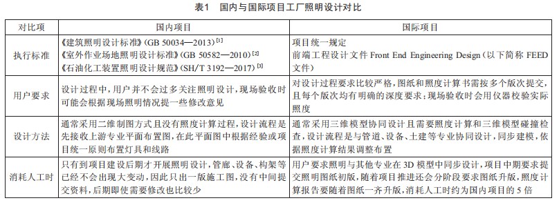 由于執(zhí)行標(biāo)準(zhǔn)、用戶要求以及建設(shè)模式不同,國(guó)內(nèi)和國(guó)際項(xiàng)目工廠照明設(shè)計(jì)有較大差異,以某個(gè)按照歐美標(biāo)準(zhǔn)體系執(zhí)行的大型國(guó)外煉廠項(xiàng)目為例,其國(guó)內(nèi)外項(xiàng)目工廠照明設(shè)計(jì)對(duì)比如表1所示??偟膩?lái)說(shuō),國(guó)際項(xiàng)目照明設(shè)計(jì)要求更高,對(duì)照明設(shè)計(jì)人工時(shí)要求較高,此方式是否適用于國(guó)內(nèi)項(xiàng)目還需要根據(jù)項(xiàng)目實(shí)際情況進(jìn)行分析。