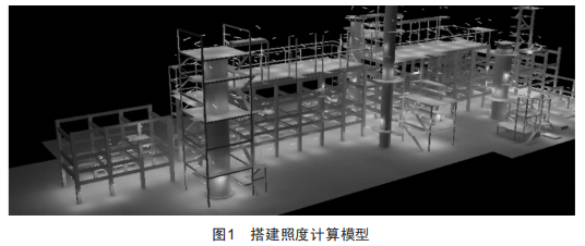 利用三維模型在DIALux軟件中搭建出管橋、構(gòu)架、平臺(tái)以及設(shè)備等基本模型,也可以自由創(chuàng)建一些參數(shù)化設(shè)備,例如泵、塔或者罐等設(shè)備,只需要建立一個(gè)模型,其他同類(lèi)設(shè)備通過(guò)改參數(shù)的方法就可以復(fù)制生成。圖1為某項(xiàng)目搭建完成的計(jì)算模型。