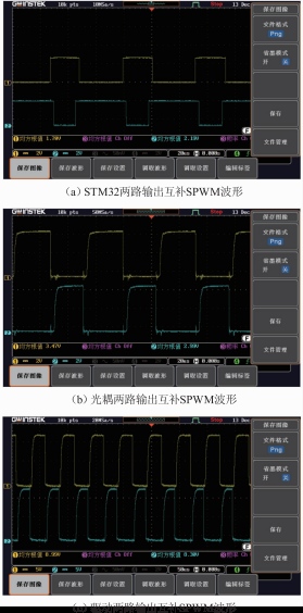 SPWM波形輸出測試:橋式電路中M0SFET開關(guān)管驅(qū)動波形采用的是雙極性調(diào)制方式,由STM32控制芯片產(chǎn)生兩路互補的SPWM驅(qū)動波形。由圖3(a)可以看出,SPWM驅(qū)動波形輸出電壓約為3.3V,等同于STM32引腳輸出電壓幅值,SPWM驅(qū)動波形頻率為12.8kHz,SPWM驅(qū)動波形死區(qū)時間為1μS,結(jié)果表明SPWM波形滿足設計要求。
