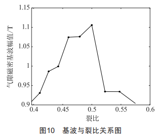 圖9為齒槽轉(zhuǎn)矩隨著裂比變化的波形圖,由圖可以看出,齒槽轉(zhuǎn)矩隨著裂比的增大,呈現(xiàn)先增大后減小的趨勢(shì)。