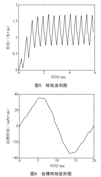 齒槽轉(zhuǎn)矩是電機(jī)噪聲和振動(dòng)產(chǎn)生的主要因素,將會(huì)降低電機(jī)運(yùn)行的可靠性,對(duì)電機(jī)性能有較大的負(fù)面影響。圖6為電機(jī)在額定轉(zhuǎn)速運(yùn)轉(zhuǎn)時(shí)的齒槽轉(zhuǎn)矩示意圖,由圖可知電機(jī)的齒槽轉(zhuǎn)矩峰值約為35.5mN·m,約為額定轉(zhuǎn)矩的2.5%。
