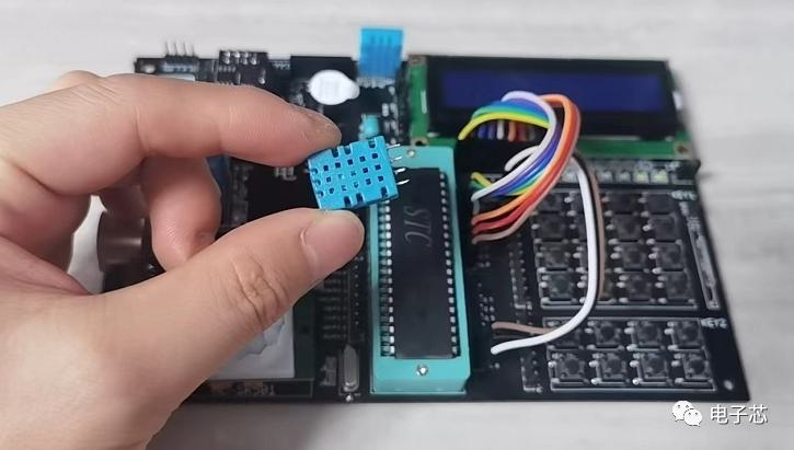 接下來通過手去感受各個器件表明的溫度,單片機等模塊都是正常溫度。所以嘗試再次使用5V適配器進行供電。通電后,液晶顯示正常,因此我判斷單片機是沒有問題的(注意這里的判斷,此時斷定單片機沒有燒壞)。但是液晶不顯示溫濕度數(shù)據(jù),所以應(yīng)該是DHT11出現(xiàn)溫度。