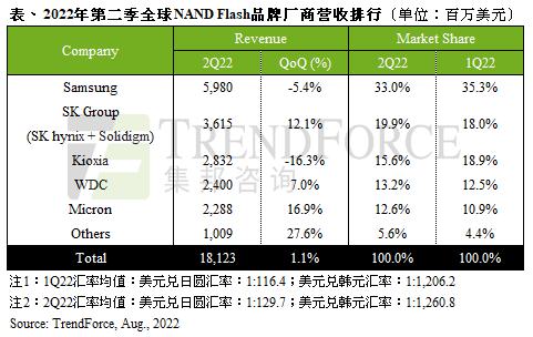 由于消費(fèi)端需求疲弱,即便智能手機(jī)平均容量仍顯成長(zhǎng),但出貨量重挫抵消對(duì)mobile NAND Flash的需求。同時(shí),PC客戶持續(xù)下調(diào)出貨預(yù)期,導(dǎo)致client SSD出貨持平。反觀,服務(wù)器出貨暢旺,數(shù)據(jù)中心對(duì)enterprise SSD的需求仍有支撐,整體使三星(Samsung)第二季位元出貨雖然季減近10%,但得益于匯率及高容量產(chǎn)品的助力,產(chǎn)品組合轉(zhuǎn)佳下,帶動(dòng)NAND Flash銷售均價(jià)有所增加,營(yíng)收達(dá)59.8億美元,季減5.4%。