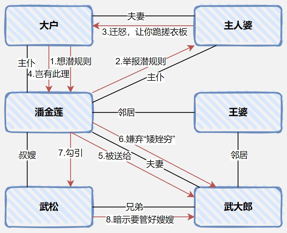 以上,就是把這些信息挖掘出來,用粗略點的圖示可以大概勾畫出來人物的關(guān)系和行為動作: