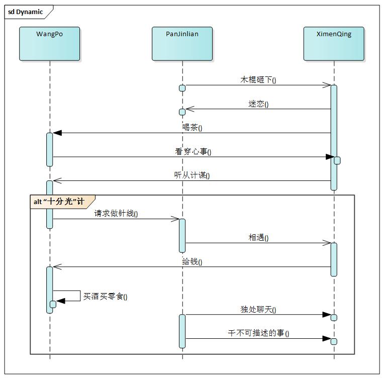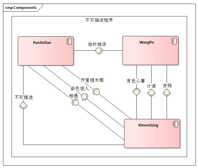 上專業(yè)的設(shè)計工具EA,為了簡要說明這個不可描述的情節(jié),部分需求沒有完全體現(xiàn)在這架構(gòu)里面。(這里省略了WuDalang的角色)