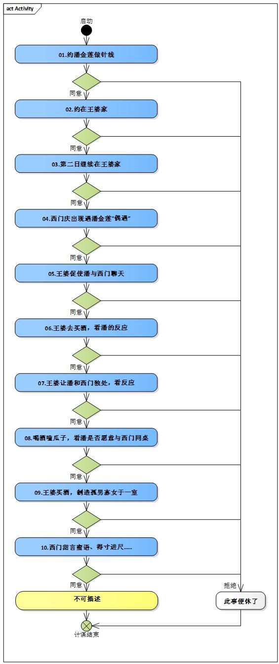 這計謀設(shè)計好后,王婆還真按照這套路實施一遍,還沒啥差錯,比設(shè)想的更加順暢。小說生活里面的情節(jié)是無法測試的,運行測試就是真實執(zhí)行了。