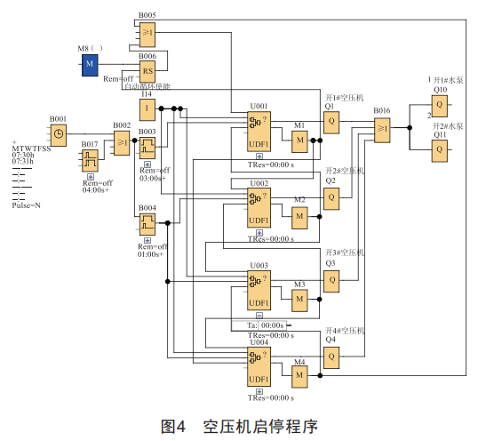 自動(dòng)啟??刂葡到y(tǒng)基于西門子LOGO!模塊實(shí)現(xiàn),模塊配置LOGO!一8V2程序系統(tǒng),采用LoGo程序編輯軟件,按照當(dāng)前生產(chǎn)現(xiàn)場(chǎng)用氣量的實(shí)際需求進(jìn)行程序設(shè)計(jì)[2],實(shí)現(xiàn)精準(zhǔn)、穩(wěn)定供氣。4臺(tái)空壓機(jī)采用并聯(lián)控制模式,循環(huán)交替地開(kāi)啟和關(guān)閉,降低了不必要的設(shè)備磨損。其控制程序設(shè)計(jì)如圖2所示。