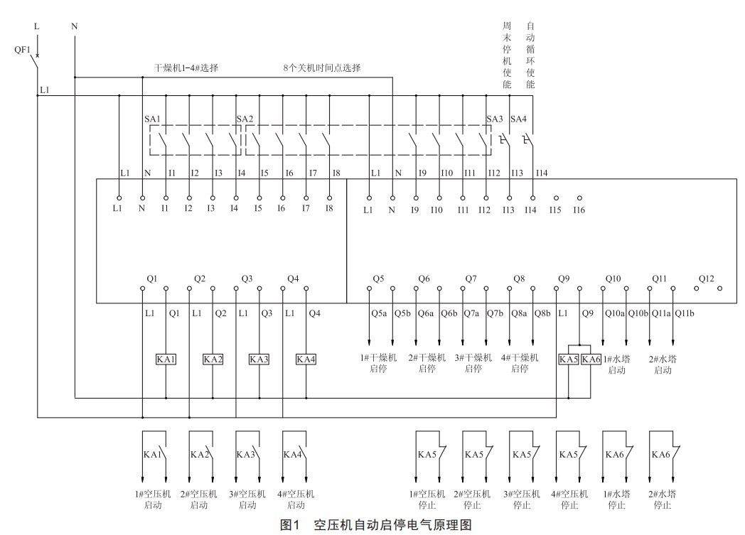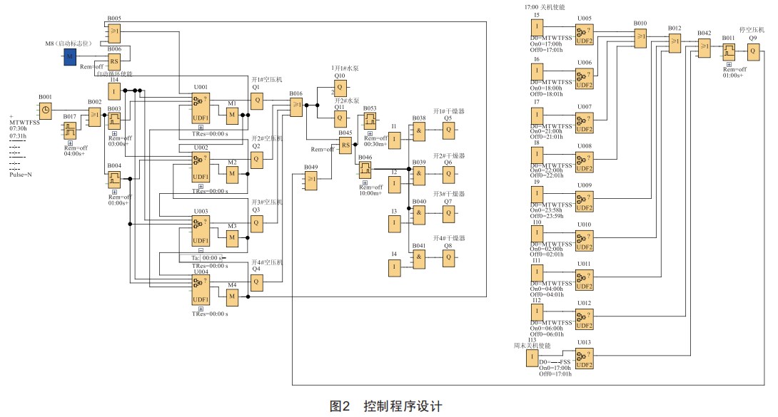 空壓機(jī)組的定時(shí)啟停屬于典型的自動(dòng)控制范疇,其設(shè)計(jì)思想是以時(shí)間信號(hào)作為觸發(fā)輸入,由中央處理器進(jìn)行邏輯判斷并輸出執(zhí)行信號(hào),通過(guò)中間繼電器控制接觸器,進(jìn)而實(shí)現(xiàn)對(duì)主回路執(zhí)行器件的控制:干燥器的主要作用是對(duì)新產(chǎn)生的氣源進(jìn)行干燥處置,系統(tǒng)本身具有本地控制、遠(yuǎn)程控制和網(wǎng)絡(luò)控制功能,采用時(shí)間延時(shí)啟動(dòng)和遠(yuǎn)程控制的模式實(shí)現(xiàn)干燥器的自動(dòng)啟停:空壓機(jī)組為水冷式螺桿壓縮機(jī),對(duì)冷卻水的流量、速度和溫度有較高要求,冷卻水溫度過(guò)高會(huì)造成空壓機(jī)高溫報(bào)警而停機(jī),故冷卻水泵與冷卻水塔和空壓機(jī)須同時(shí)啟動(dòng),以滿足氣源制造過(guò)程中循環(huán)水的冷卻降溫要求。依據(jù)自動(dòng)控制系統(tǒng)的設(shè)計(jì)思路,中央處理器選用西門子旗下LOGO!DM16230R模塊,帶有8個(gè)數(shù)字輸入和8個(gè)數(shù)字輸出端口,內(nèi)含繼電器、時(shí)鐘和脈沖發(fā)生器以及與、或、非等功能模塊,具有經(jīng)濟(jì)方便、可靠性高、抗干擾能力強(qiáng)等特點(diǎn),完全可以滿足空壓機(jī)組自動(dòng)啟停控制的需要。