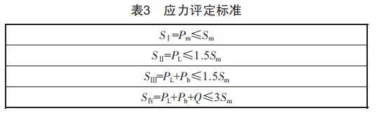 根據(jù)《鋼制壓力容器一分析設(shè)計(jì)標(biāo)準(zhǔn)》(JB4732一95)的要求,需要將結(jié)構(gòu)危險(xiǎn)點(diǎn)按一次總體薄膜應(yīng)力Pm、一次局部薄膜應(yīng)力PL、一次彎曲應(yīng)力Pb、二次應(yīng)力Q等不同類(lèi)的應(yīng)力以及組合的當(dāng)量應(yīng)力進(jìn)行校核,評(píng)定標(biāo)準(zhǔn)如表3所示。