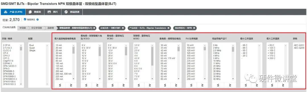 下圖是在貿(mào)澤電子上檢索三極管的局部截圖: