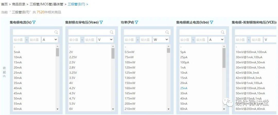 去賣元器件的電子商城上看看,比如貿(mào)澤電子、立創(chuàng)商城等。商城為了方便客戶快速找到他們想要的目標(biāo)器件,設(shè)置了多個篩選條件。那這些篩選條件,正好就是我們進(jìn)行三極管選型時需要重點(diǎn)關(guān)注的參數(shù)特性。