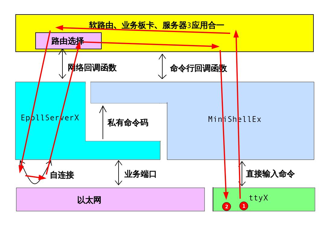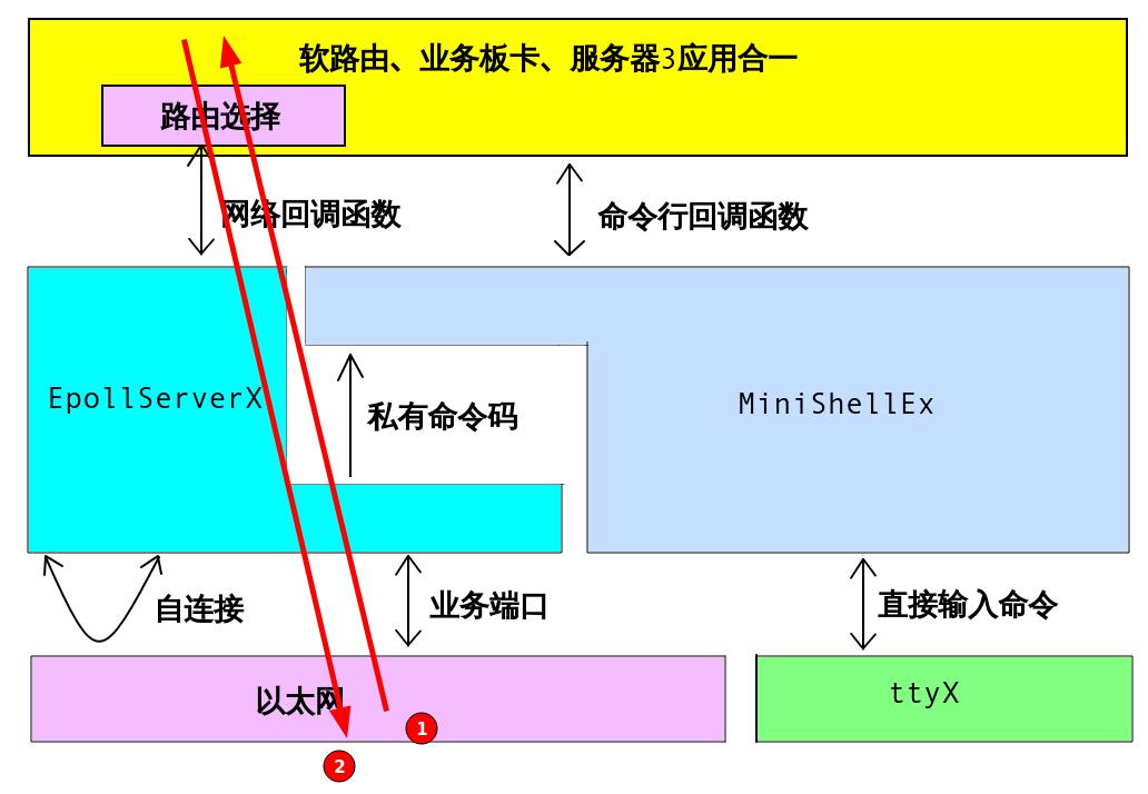 EpollServerX監(jiān)聽兩個端口,端口2000是項目業(yè)務(wù)所需要的,協(xié)議按照項目的來。業(yè)務(wù)命令碼有近100條,我特意向產(chǎn)品經(jīng)理申請一條私有命令碼。留下一條后門,專門用于傳送字符串,字符串的內(nèi)容提供給MiniShellEx解析,使我有更多的方式去調(diào)試。